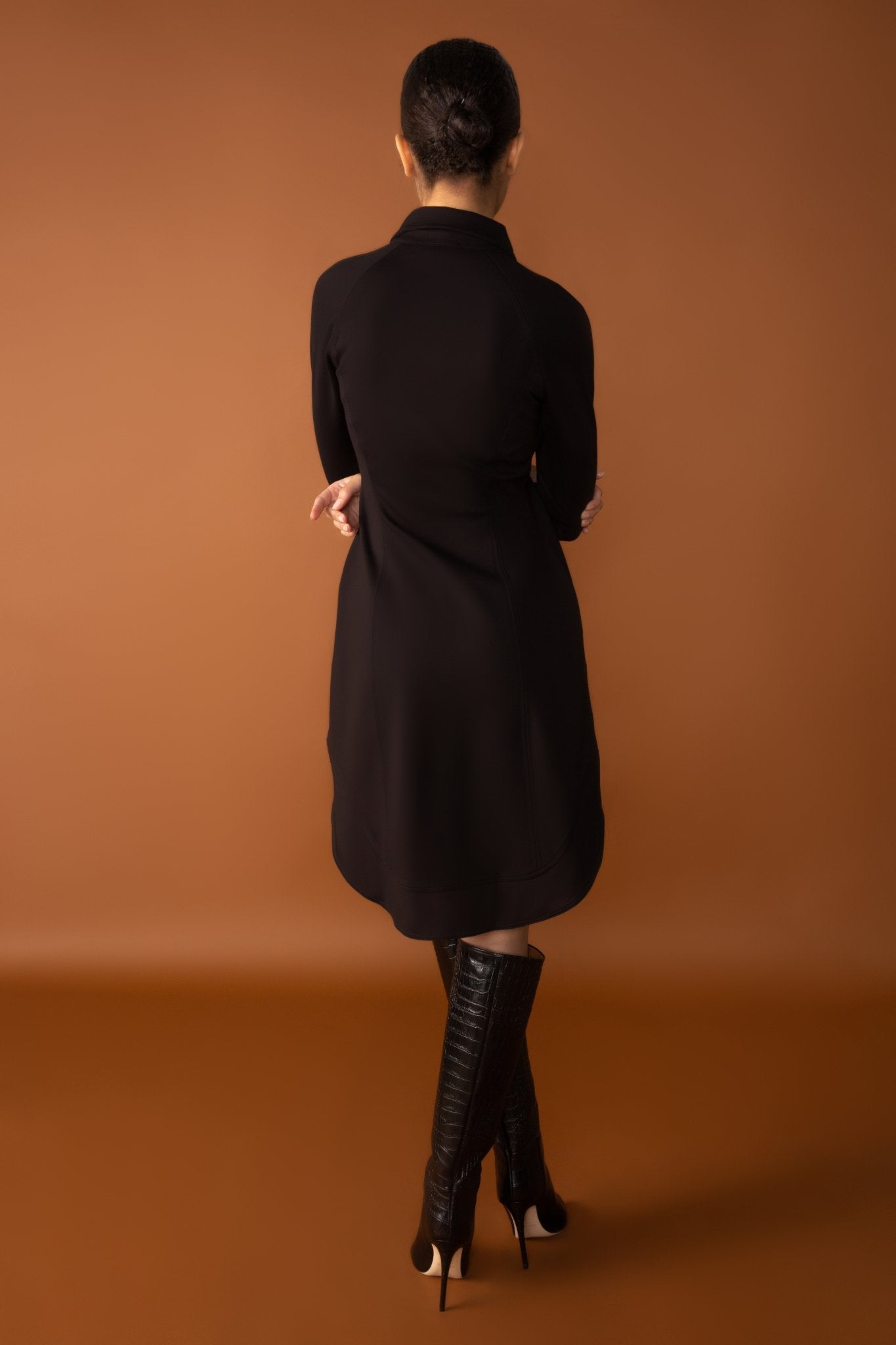 The classic shirt dress is re-imagined with a sporty yet distinctly feminine feel. Finished with a curved hem that falls to just above the knee and finshes slightly longer in the back.